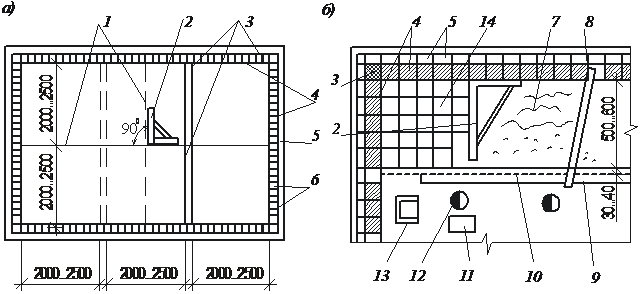 а – разметка и укладка маячных и фризовых плиток; б – укладка плиток по угольнику; 1 – шнуры по оси помещения; 2 –угольник; 3 – маячные плитки; 4 –фризовый ряд плиток; 5 – заделка у стен обрезками плиток; 6 –маячные ряды плиток; 7 –раствор; 8 – правило; 9 –маячная рейка; 10 –шнур; 11 –скамейка; 12 –рабочее место облицовщика-плиточника; 13 –