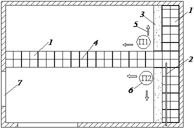 1 – маячный ряд плитки; 2 – контрольная рейка-правило длиной 2 м; 3 – прослойка мастики; 4 – направляющий шнур; 5 – направление укладки; 6 – рабочие места плиточников; 7 – дверной проем