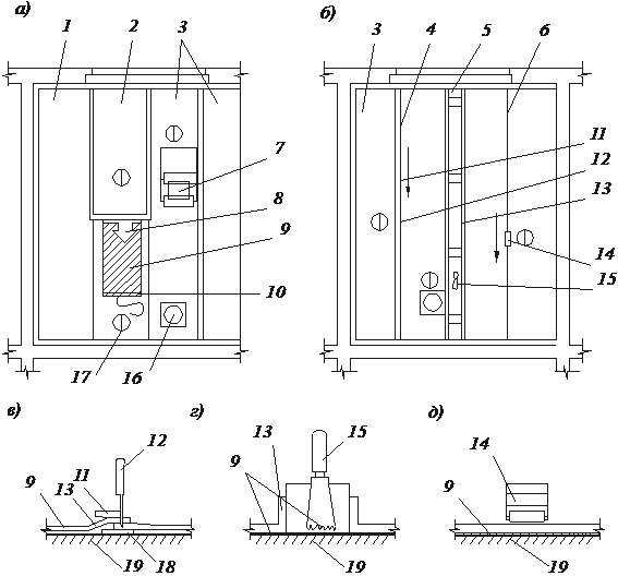 При этом выполняют следующие операции: подготовка и уточнение размеров проема; монтаж верхней и нижней направляющих; наклейка в направляющие резиновых лент; очистка элементов стеклопрофилита и наклейка на одну боковую грань уплотнительной прокладки (ленты); установка 4 или 5 элементов стеклопрофилита; обжатие смонтированного участка и постановка удерживающего устройства; установка элементов стеклопрофилита на последующих участках; установка прижимного элемента (плинтуса); заделка стыков герметизирующей мастикой; очистка поверхности; проверка качества заполнения проема. На рис. 21.7, а, б показаны схемы выполнения основных операций при устройстве светопрозрачной конструкции из стеклопрофилита.