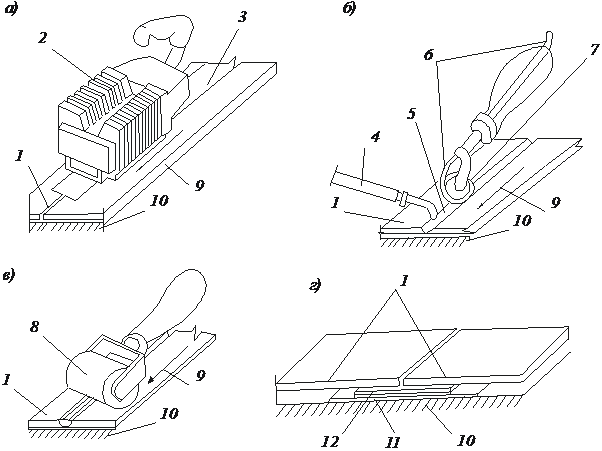 а – сварка линолеумов инфракрасным излучением; б – то же, горячим воздухом; в – прикатка шва валиком; г – склейка кромок линолеумов; 1 – кромки линолеумов; 2 – излучатель «Пилад»; 3 – термостойкая пленка; 4 – ручная горелка для подачи горячего воздуха; 5 – конусная канавка для присадочного прутка; 6 – присадочный пруток; 7 – прижимной ролик для поддержания прутка; 8 – металлический валик для прикатки шва; 9 – направление движения инструмента; 10 – основание; 11 – полоса бумаги шириной 100 мм; 12 – полоса мешковины или