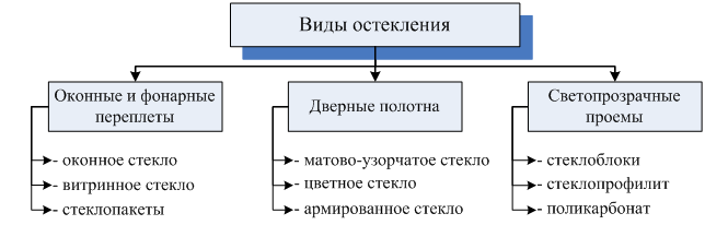 Для остекления применяют листовое, матово-узорчатое, тонированное и армированное стекло, стеклопакеты, стеклопрофилит, стеклоблоки, а также уплотнители, герметики и крепежные детали.