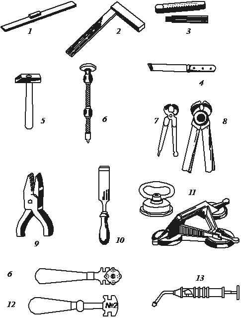 1 – линейка; 2 – угольник; 3 – метр; 4 – нож для замазки; 5 – молоток; 6 – стеклорез; 7 – клещи; 8 – кусачки; 9 – плоскогубцы; 10 – стамеска; 11 – вакуум-присосы; 12 – алмаз; 13 –шприц для промазки фальцев