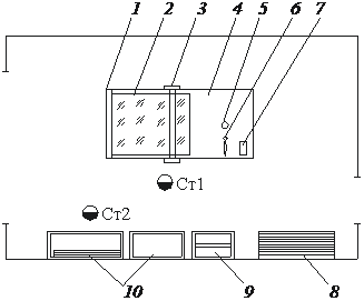 | Рис.21.3. Организация рабочего места при нарезке стекол: 1 – упор; 2 – лист стекла; 3 – рейсшина; 4 – стол стекольщика; 5 – рулетка; 6 – алмаз (стеклорез); 7 – ветошь; 8 – стеллаж для листов оконного стекла; 9 – ящик для обрезков стекла; 10 – ящик для мерного стекла |