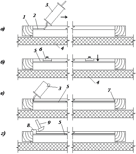 а – наклейка основной части полотнищ; б – прирезка и приклейка кромок между смежными полотнищами; в – прирезка кромок рулонных материалов; г – нанесение мастики для приклейки кромок полотнищ; д – прикатка кромок ножным катком; 1 – уложенное насухо полотнище; 2 – приклеиваемое полотнище; 3 – наклеенное полотнище; 4 – прирезка кромок полотнищ; 5 – приклейка кромок полотнищ; 6 – прикатка кромок полотнищ; 7 – виброкаток; 8 – направление наклейки полотнищ; 9 – клей или мастика; 10 – большой зубчатый шпатель; 11 – линейка; 12 – нож для прирезки линолеума; 13 – отогнутые кромки линолеума; 14 – ножной каток; 15 – малый зубчатый шпатель; 16 – бачок для клея или мастики; 17 – рабочие места облицовщиков синтетическими материалами; 18 – полоса из фанеры или
