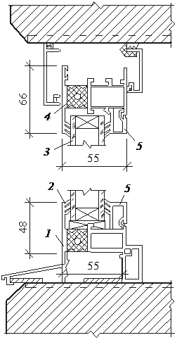 | Рис. 21.6. Установка стеклопакетов в алюминиевые переплеты: 1 – алюминиевый переплет; 2 – резиновый уплотнитель; 3 – стеклопакет; 4 – термовкладыш; 5 – защелка-штапик |