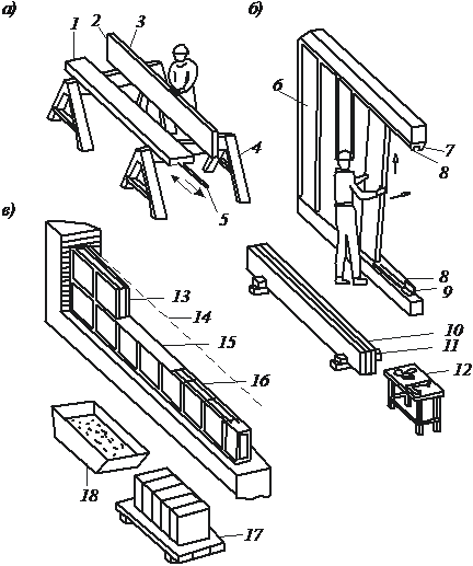 1 – элемент профильного стекла в момент очистки; 2 – то же при наклеивании прокладок на ребро; 3 – прокладка; 4 – козелок; 5 – протирка; 6 – смонтированный элемент профильного стекла; 7 – верхний элемент каркаса; 8 – полоса из резины; 9 – нижний элемент каркаса; 10 – штабель стеклопрофилита; 11 – прокладка; 12 – столик с набором инструментов; 13 – стеклоблок; 14 – шнур-причалка; 15 – раствор; 16 – арматурный стержень; 17 –