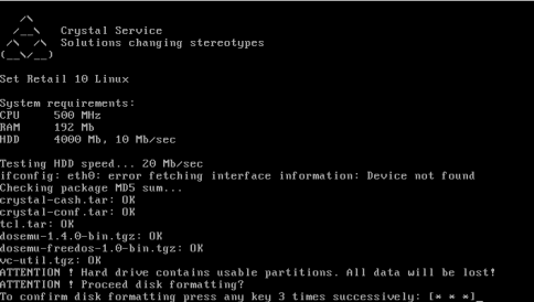 После загрузки ядра операционной системы оценивается соответствие системным требованиям (процессор — 500 МГц, ОЗУ — 256 Мб, жёсткий диск — 4000 Мб, скорость диска — 10 Мб/сек), проверяется подключение к сети. В случае успеха проверяется контрольная сумма (MD5) дистрибутива и начинается установка. Вся старая информация будет утрачена.