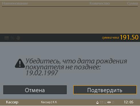 Напоминание кассиру проверить возраст покупателя при продаже алкоголя и табачных изделий