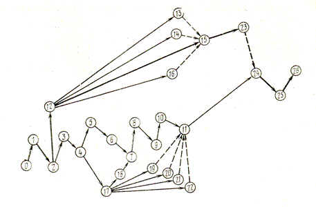 Работы, изображенные утолщенными линиями, лежат на критическом пути; штриховыми линиями обозначены связи между событиями (фиктивные работы)