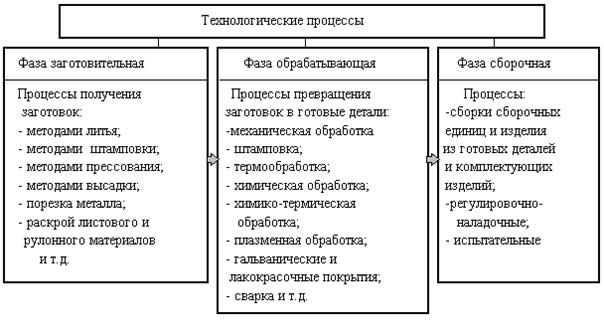 Фаза - комплекс работ, выполнение которых характеризует завершение определенной части технологического процесса и связано с переходом предмета труда из одного качественного состояния в другое. В машиностроении и приборостроении технологические процессы в основном делятся на три фазы: заготовительная; обрабатывающая; сборочная. Фазная структура технологических процессов представлена на рисунке 6.