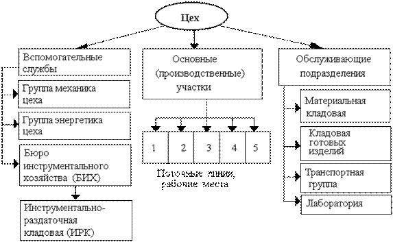 В цехах (подразделениях) основного производства предметы труда превращаются в готовую продукцию. Цехи (подразделения) вспомогательного производства обеспечивают условия для функционирования основного производства (инструменты, энергия, ремонт оборудования). Подразделения обслуживающего производства обеспечивают основное и вспомогательное производства транспортом, складами (хранение), техническим контролем и т.д.
