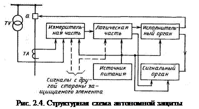 Способы выполнения защит весьма разнообразны. Однако все они обычно строятся на электрических принципах, выполняются в большинстве случаев автономными устройствами и имеют в общем случае две главные части (рис. 2.4) – измерительную н логическую. Измерительная часть, включающая измерительные органы, непрерывно контролирует состояние защищаемого объекта и определяет условия срабатывания в соответствии со значениями входных воздействующих величин. Логическая часть, включающая логические органы, формирует управляющие воздействия в зависимости от комбинации и последовательности поступления на нее сигналов от измерительной части. Обычно логическая часть действует на выключатели не непосредственно, а через исполнительный орган. Измерительная часть, как правило, получает информацию о токах и напряжениях в месте включения защиты через . первичные измерительные преобразователи – трансформаторы тока и напряжения (ТА и TV).
