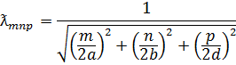 Из (3) следует, что наиболее низкая частота соответствует наименьшим значениям индексов m, n, p. Они не могут одновременно обращаться в ноль, так как в противном случае не может быть волн. Наименьшими значениями индексов, при которых выражение (1) не обращается в ноль следующие :