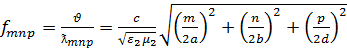 , определяемых значениями индексов m, n, p. При этом m, n, p определяют число полуволн поля, укладывающихся на сторонах a и b соответственно, а индекс p- число полуволн поля, укладывающихся на длине резонатора d.Каждому колебанию соответствует длина волны и собственная частота: