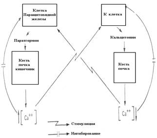 Сам кальций, являющийся объектом контроля, выступает в роли положительного (кальцитонин) или отрицательного (паратгормон) сигнала собственной регуляции (рис.8.5).