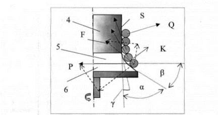 4- корпус барабана. 5-галтель барабана; 6- «юбка» барабана; F - сила давления набегающего витка, К - сила трения между витками , S - сила воздействия соседнего витка; Р - сила волочения; Q - сила натяжения сбегающей ветви; γ -угол конусности барабана; α - угол отклонения набегающего витка.β - угол конусности "юбки" барабана.
