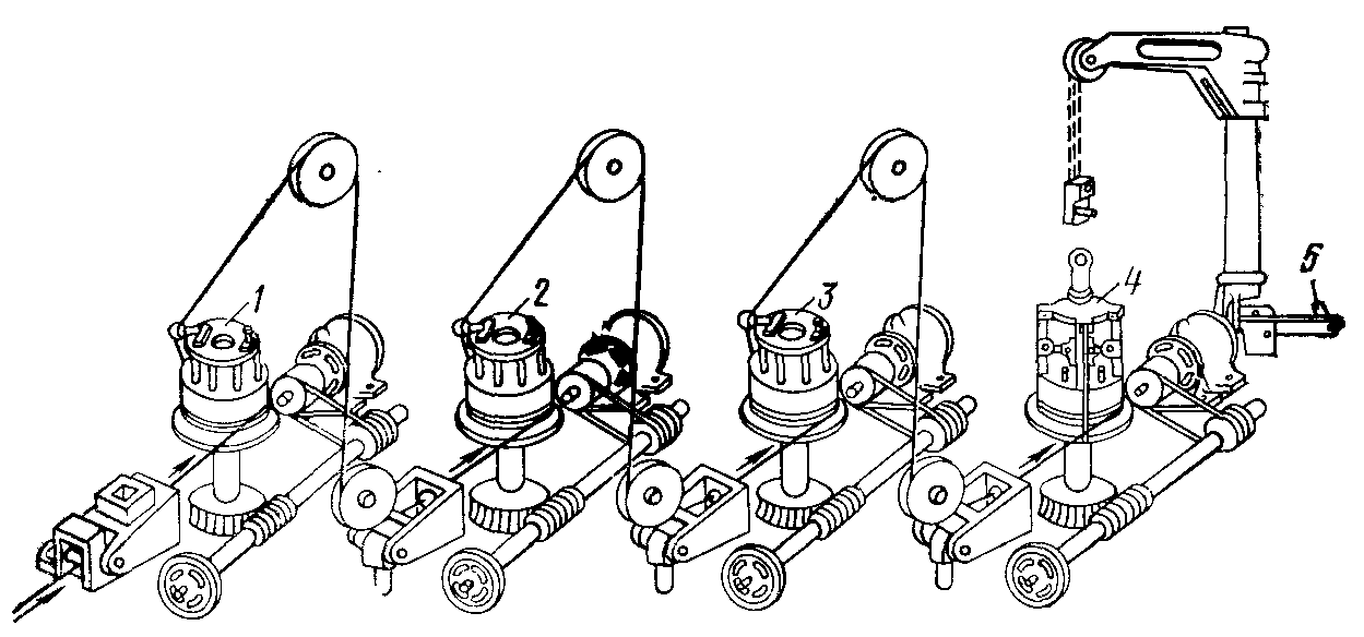 1 — ступенчатые шкивы; 2 — волокодержатели; 3 — чистовой барабан;