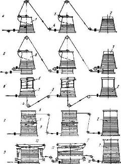 Рис. 6. Схемы машин многократного волочения магазинного типа с одинарными барабанами обычного типа (а), двухступенчатыми барабанами (б), барабанами с внутренним полым валом для проводки проволоки (в), сдвоенными двухъярусными барабанами (г), сдвоенным наружным и внутренним барабанами (д):