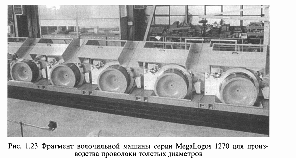 Проволока при переработке на этих машинах протягивается через волоку и наматывается на барабан, на котором создается определенный запас витков проволоки (до 1/3 барабана). Далее через поводковое устройство, верхний и нижний направляющие ролики проволока поступает в волоку следующего барабана; затем то же самое повторяется на следующих барабанах.