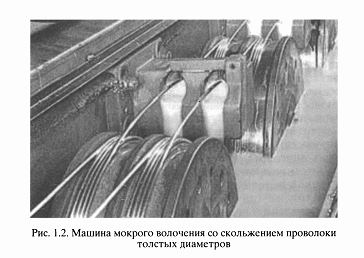Рассмотренные выше станы многократного волочения, работающие без скольжения проволоки на промежуточных барабанах, применяют наиболее широко. Их используют для волочения проволоки почти всего сортамента, при этом обеспечивается высокая производительность. Кратность машин до 15 и более, поэтому можно применять большие суммарные обжатия. Единичные обжатия допускается изменять в широком диапазоне.