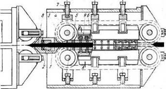 Конец прутка по периметру поперечного сечения зажимается подающими элементами, а необходимое усилие обеспечивается нажимными винтами 5 и 7, которые передают это усилие через опорную балку 6, тарельчатые пружины и опорные стойки. Стойки через опорные ролики 9 передают усилие зажатия подающим элементам. Усилие, необходимое для вталкивания или выталкивания прутка из волочильного очка при заданной величине обжатия, создается за счет сил трения. Длина цепи такова, что материал соприкасается с достаточным количеством зажимающих звеньев для того, чтобы обеспечить относительно низкое удельное давление на поверхности протягиваемого прутка. Вышедший из волоки конец прутка 8 захватывается следующим механизмом, при этом создается непрерывность процесса волочения.
