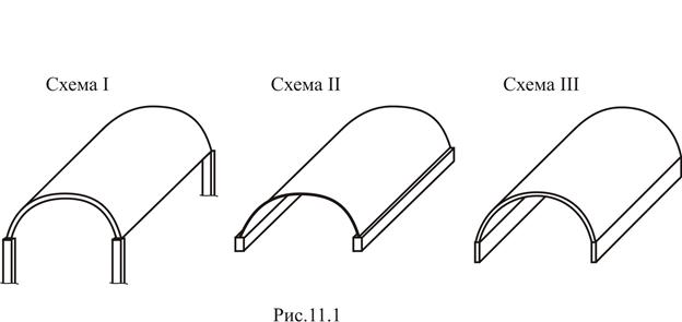 Основные типы конструктивных решений покрытий представлены на рис. 11.1. Первый из них характеризуется многоволновой оболочкой, опирающейся непосредственно на колонны (схема I). Во втором случае опирание происходит через бортовой элемент – балку (схема II). В последнем варианте рассматривается оболочка, плавно переходящая в бортовой элемент, в котором возможно появление кручения (схема III). Оболочка считается короткой, если отношение длины оболочки к радиусу цилиндра не превышает единицы, т. е. при