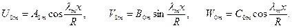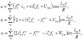 Вычислив производные функции напряжений, входящие в формулы для перемещений (11.11), и суммируя их с выражениями (11.16), несложно найти перемещения оболочки: