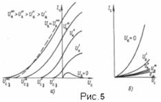 < 0 отличаются от теоретических. Они идут несколько более полого, чем теоретические характеристики, и медленнее приближаются к оси абсцисс вблизи напряжения запирания. Для сравнения одна из теоретических характеристик показана на рисунке штриховой линией.