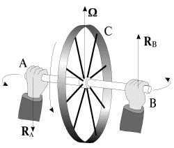 приводят к интересному эффекту: вал стремится вырваться из рук и повернуться в вертикальной плоскости; он действует на кисти рук с определенными силами RA и RB (рис. 10). Требуется приложить ощутимое физическое усилие, чтобы удержать вал с вращающимся колесом в горизонтальной плоскости.