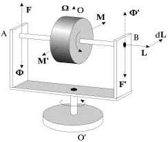 Раскрутим гироскоп вокруг его вокруг его оси симметрии до большой угловой скорости (момент импульса L) и станем поворачивать раму с укрепленным в ней гироскопом вокруг вертикальной оси OO' с некоторой угловой скоростью