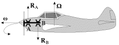 Пример. Легкий одномоторный самолет с правым винтом совершает левый вираж (рис. 13). Гироскопический момент передается через подшипники А и В на корпус самолета и действует на него, стремясь совместить ось собственного вращения винта (вектор