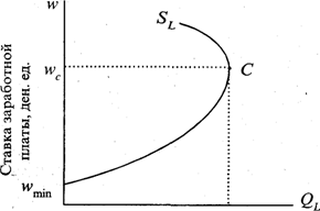 Рассматривая зависимость предложения труда от изменения ставок заработной платы, необходимо обратить внимание на то, что кривая предложения индивидом своего труда,описывающая эту зависимость, имеет несколько необычную форму (рис. 24).