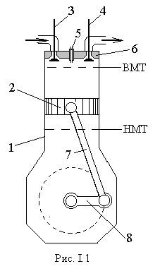 Термодинамический анализ любого двигателя, как и любого другого устройства, начинается с изучения конструкции, что позволяет поставить задачу исследования и обосновать те или иные упрощающие допущения. На рис. I.1 приведена принципиальная схема четырёхтактного карбюраторного двигателя. В цилиндре 1 может двигаться поршень 2 между крайними положениями ВМТ (верхняя мёртвая точка) и НМТ (нижняя мёртвая точка). При движении поршня вниз за счёт разрежения при открытом впускном клапане 3 и закрытом выпускном клапане 4 в головке блока 6 в цилиндр поступает подготовленная в карбюраторе смесь паров бензина с воздухом. При достижении поршнем нижней мёртвой точки (НМТ) впускной клапан закрывается, поршень начинает движение вверх при закрытых клапанах, смесь сжимается, её давление и температура повышаются. При достижении поршнем верхней мёртвой точки (ВМТ) смесь принудительно поджигается за счёт искры между электродами свечи 5. Давление продуктов сгорания при взрыве смеси практически мгновенно повышается, поршень начинает двигаться вниз, возникающее при этом усилие передаётся через шатун 7 на кривошип 8 и далее через коробку передач и трансмиссию на внешнюю нагрузку, например на колёса автомобиля. По достижении поршнем нижней мёртвой точки (НМТ) принудительно открывается выпускной клапан, продукты сгорания под действием повышенного давления вытекают из цилиндра через глушитель и выхлопную трубу в атмосферу. Далее при открытом выпускном клапане поршень, двигаясь вверх к ВМТ, выталкивает остатки продуктов сгорания. Затем вся последовательность описанных выше процессов (цикл) повторяется. Легко видеть, что замкнутая последовательность процессов изменения состояния рабочего тела (цикл) в таком двигателе совершается за два оборота коленчатого вала.