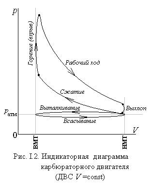 Весьма важной с практической точки зрения является так называемая индикаторная диаграмма двигателя, представляющая собой зависимость давления в цилиндре двигателя от угла поворота коленчатого вала или положения поршня. Экспериментально эта зависимость измеряется прибором, называемым индикатором, откуда произошло её название. Типичная индикаторная диаграмма (без масштаба) карбюраторного двигателя представлена на рис. I.2.