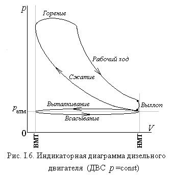 Ввиду того, что процесс рас-пыления топлива, его разогрева, испарения и сгорания внутри ци-линдра является сравнительно мед-ленным в отличие от практически мгновенного сгорания (взрыва) предварительно подготовленной в карбюраторе смеси топлива с воздухом в случае карбюраторного двигателя, индикаторная диаграмма дизельного двигателя несколько отличается от приведённой на рис. I.2.
