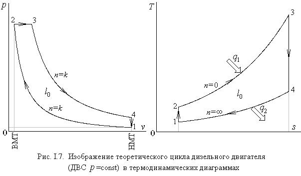Процесс подвода тепла несколько затягивается, поршень успевает за время сгорания топлива переместиться от верхней мёртвой точки на заметное расстояние, а давление при сгорании топлива изменяется мало (рис. I.6). Это обстоятельство позволяет с достаточной степенью точности считать процесс подвода теплоты в дизельном двигателе изобарным, и теоретические диаграммы этого двигателя выглядят так, как показано на рис. I.7.