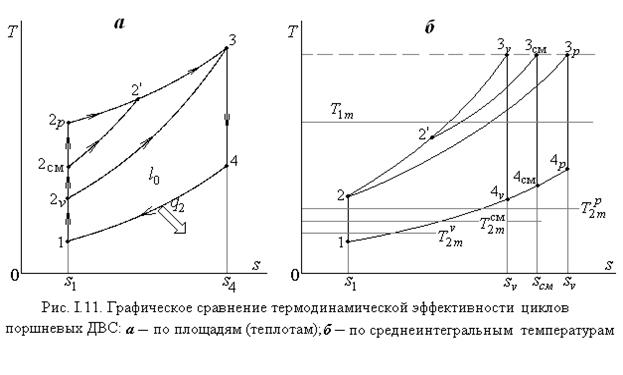 В качестве иллюстрации применения сравнения циклов по среднеинтегральным температурам на рис. I.11.б представлен нереальный с практической точки зрения, но показательный случай трёх поршневых ДВС, работающих по циклам Отто, Тринклера и Дизеля при одинаковых атмосферных условиях (совпадают точки 1), одинаковых степенях сжатия (совпадают точки 2) и одинаковых максимальных температурах (