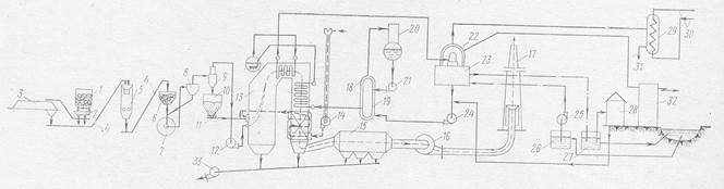 Рисунок 2 – Технологическая схема пылеугольной электростанции: 1- вагон с топливом; 2 - разгрузочное уcтройство; 3 – угольный склад;. 4 - ленточный транспортep; 5 – дробильная установка; 6 – бункер сырого угля;7 - пылеугольная мельница; 8 - сепаратор; 9 - циклон; 10 - бункер угольной пыли; 11 - питатели пыли; 12 – мельничный вентилятор; 13 – парогенератор; 14 - дутьевой вентилятор; 15 - электрофильтр; 16 - дымосос;17 - дымовая труба; 18 и 19 – регенеративные подогреватели низкого и высокого давления; 20 -деаэратор; 21 - питательный насос; 22 - турбина и электрический генератор; 23 - конденсатор; 24 –конденсатный насос; 25 – циркуляционный насос; 26 и 27 – приемный и сбросной колодцы; 28 – устройства для химической обработки добавочной воды (в химцехе); 29 - сетевой подогреватель; 30 – подающая и обратная линии сетевой воды; 31 - отвод конденсата греющего пара; 32 - главное электрическое распределительное устройство станции; 33 - багерный насос
