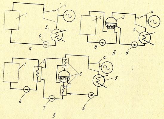 Рисунок 3 – Одноконтурная (а), двухконтурная (б) и трехконтурная (в) схемы АЭС: 1 – реактор; 2 – промежуточный теплообменник; 3 – парогенератор; 4 – турбогенератор; 5 – конденсатор; 6 – насос; 7 – циркуляционный насос ІІ контура; 8 - циркуляционный насос І контура