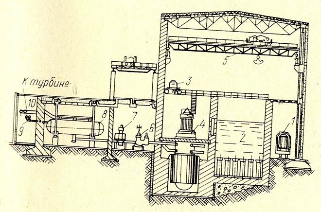 Ядерное горючее, находящееся в тепловыделяющих элементах (ТВЭЛ) определенной формы, доставляется в контейнерах 1 на электростанцию и с помощью перегрузочного крана 3 загружается в активную зону реактора 4 (рис.4). Кассеты с выгоревшими тепловыделяющими элементами помещаются в бассейн 2, где выдерживаются в течение определенного времени. Когда радиоактивность горючего и материала кассет заметно уменьшается, кассеты в контейнерах вывозятся на перерабатывающие заводы. Тепло, выделяющееся в реакторе и воспринятое теплоносителем, передается рабочей среде в парогенераторе 8. При трехконтурной схеме между теплоносителем Іконтура и рабочей средой имеется еще промежуточный контур (рис.3, в).
