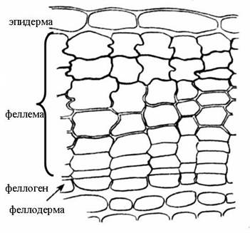 Перидерма состоит из центрального камбиального слоя – феллогена, который наружу откладывает феллему (пробку), а внутрь феллодерму.