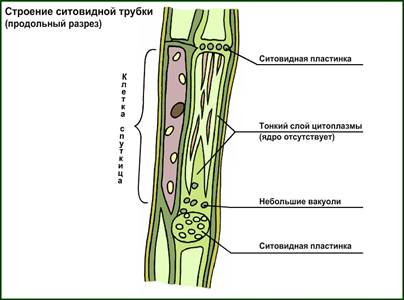 В цитоплазме клеток ситовидных трубок разрушается тонопласт и вакуолярный сок с растворёнными в нём сахарами перемешивается с цитоплазмой. Ядра отсутствуют. Клетки-спутницы сопутствующие каждому членику ситовидной трубки, выполняют вспомогательную роль в транспорте органических веществ.