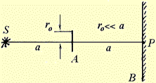 9. Волна от сферического источника S (см. рис.) интенсивнос-ти I0 падает на непрозрачный экран А, имеющий круглое отверстие, радиуса r0, которое открывает первую зону Френеля (см. рис.). При этом на экране В в точке Р отношение интенсивностей Iр/I0 равно ...