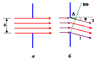 Вторичные волны за плоскостью щели можно сгруппировать в параллельные пучки, из всей совокупности которых на рис.б представ-лены два. Для лучей, идущих под углом j от крайних элементов щели, разность хода Δд, равна: