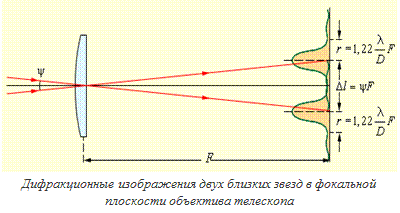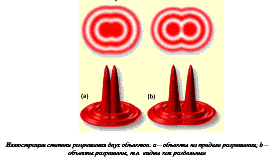 Условный критерий разрешения (критерий Рэлея) требует: два изображения находятся на пороге разрешения, когда центр дифракционного пятна одного из них совпадает с первым минимумом на дифракционной картине другого. Это соответствует минимальному угловому расстоянию между ними