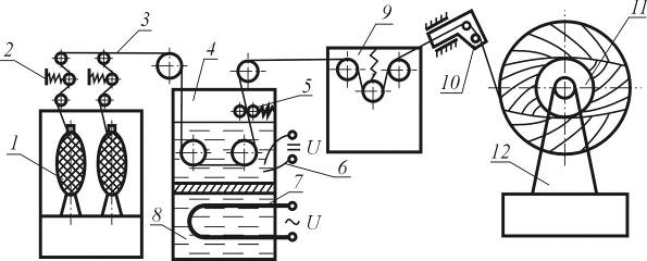 Рис.3.2. Схема "мокрой" намотки: 1 - шпулярник; 2 - индивидуальные