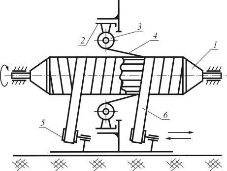 5 - поперечные раскладчики; 6 - ленты поперечной намотки