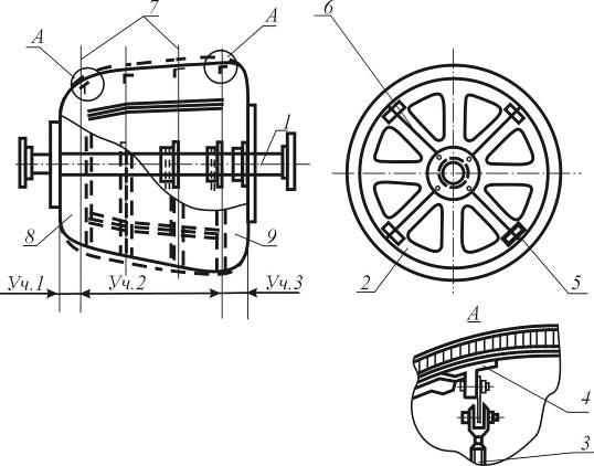 На рис.3.17 показана разборная металлическая оправка для намотки носовой части гондолы. Она состоит из оси и четырех секторов, которые подкрепляются стойками, опирающимися на ось. Для обеспечения намотки предусмотрены сферические передняя и задняя законцовки.