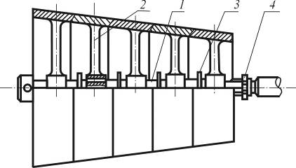 Рис.3.18. Разборная коническая оправка: 1 - ось; 2 - наборные секции