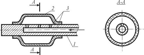 К удаляемым оправкам относятся также резиновые пневмооправки (рис.3.19), применяемые для намотки деталей диаметром до 500 мм. Оправка этого вида представляет собой резиновую оболочку, в которой для создания наматываемого изделия создается повышенное давление. После намотки и отверждения воздух стравливается и оправка удаляется через горловину изделия. Иногда используют комбинированные - металлорезиновые или гипсорезиновые оправки, обладающие более высокой жесткостью [21].